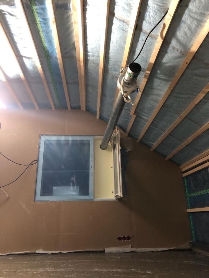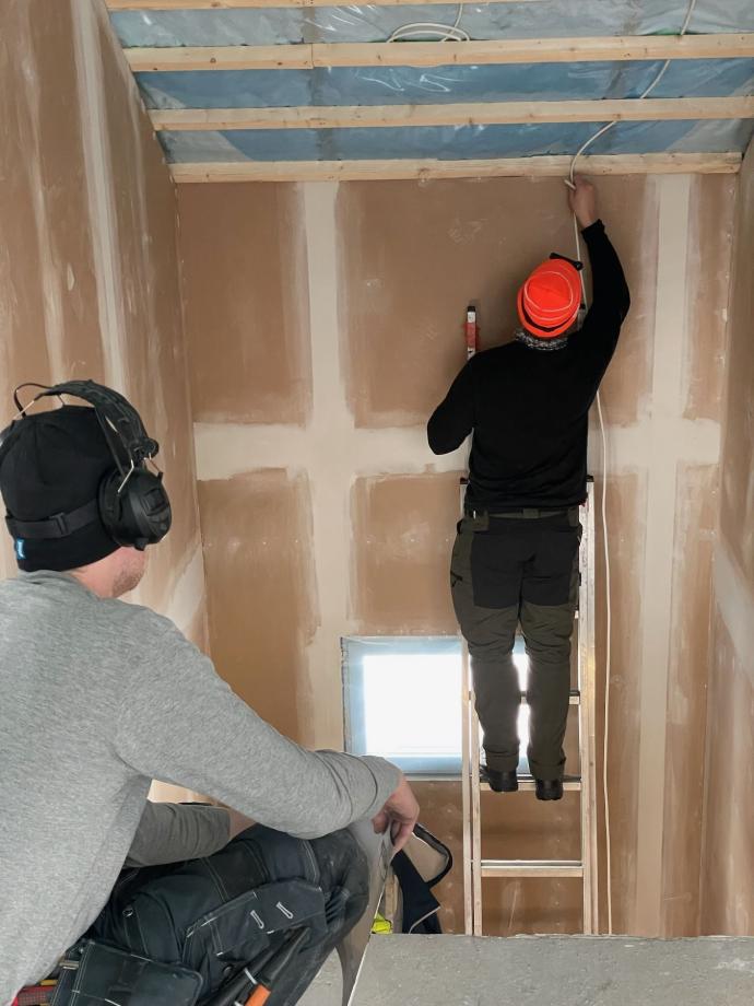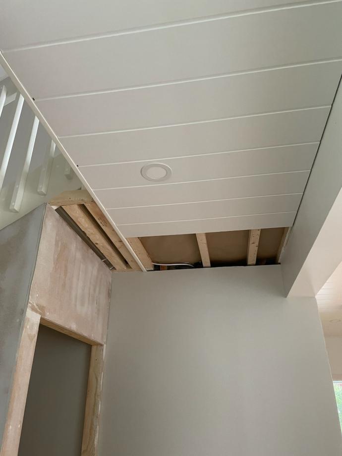 Maalattujen seinäpintojen valmistuttua alkoi myös alakerran sisäkaton levytys.