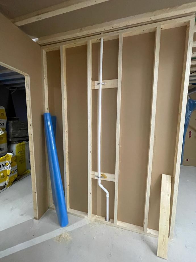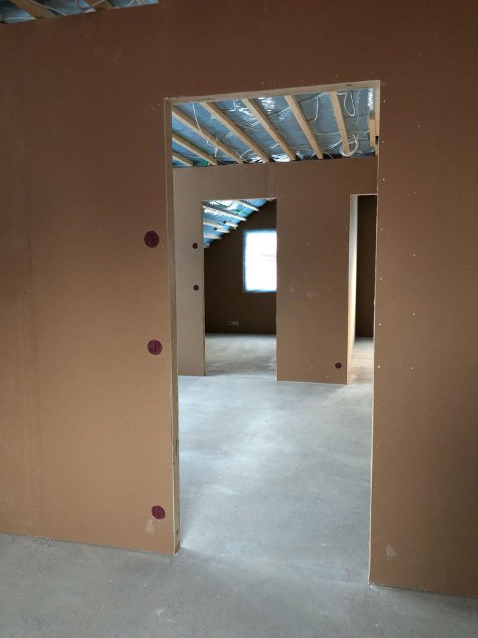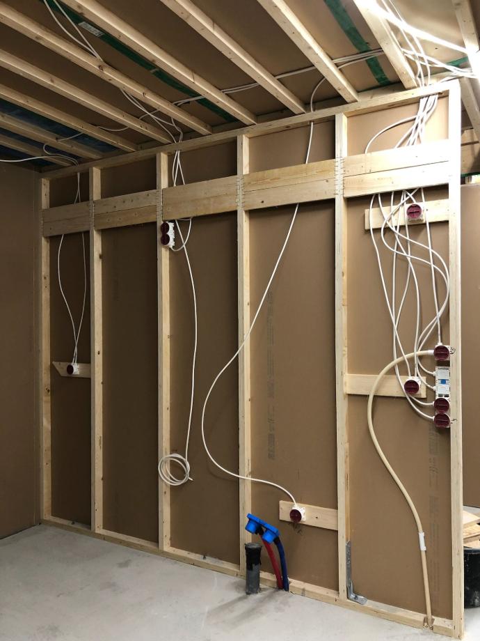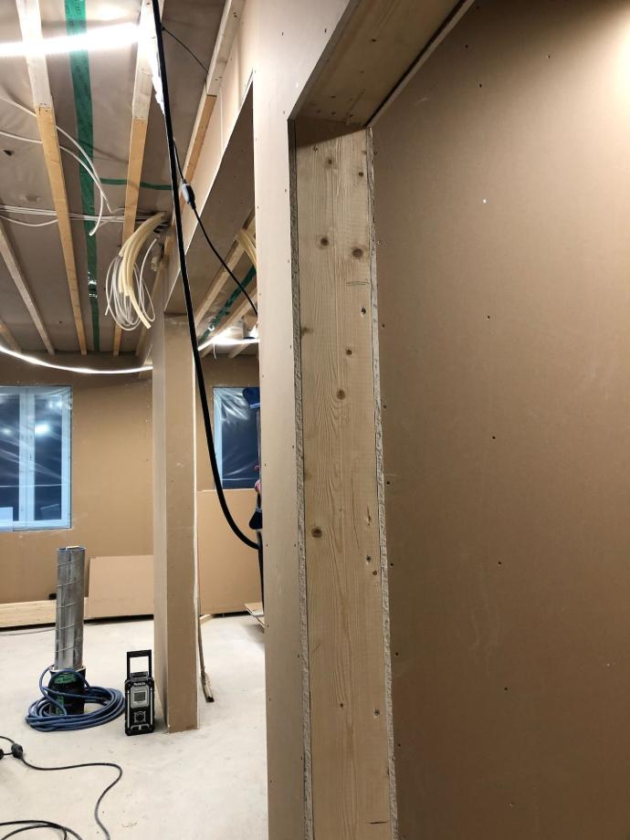 Kun kaikki seinien sisään tulevat asennukset ja äänieristeet olivat paikoillaan, levytettiin seinät myös toiselta puoleltaan.