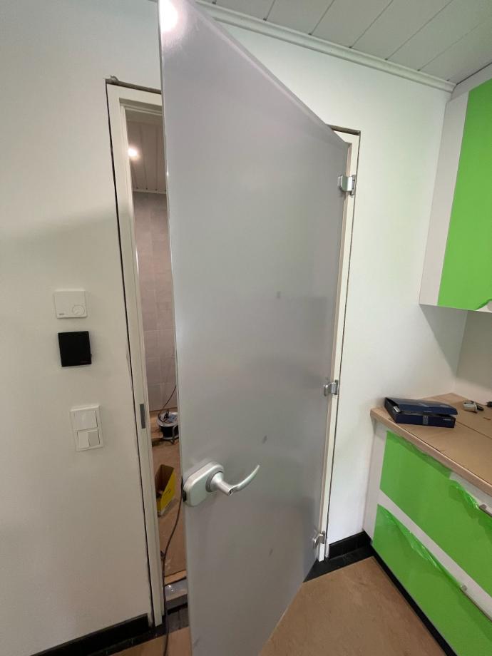 Pesuhuoneen lasiovi.