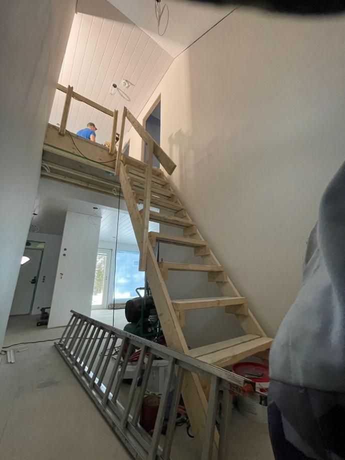 Myös yläkerran rakentaminen alkoi. Tukevat väliaikaiset portaat on ehdoton turvallisuus- ja mukavuustekijä!