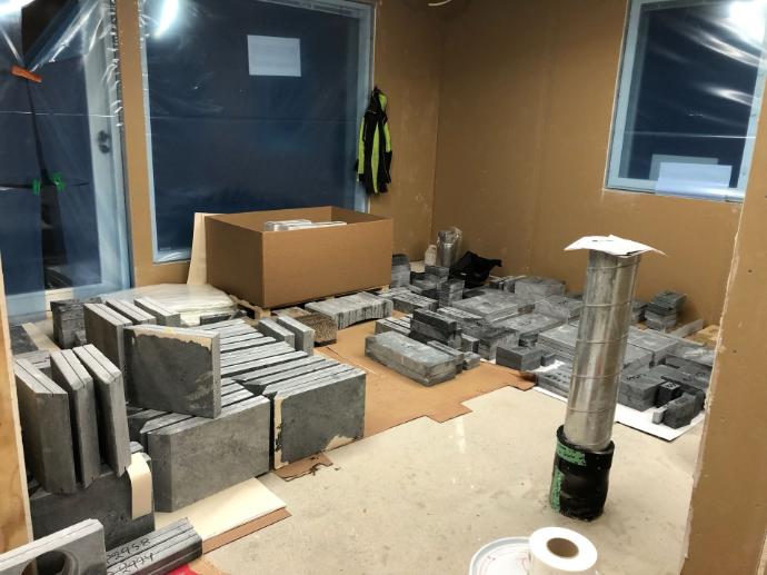 Taloon valittiin lisälämmönlähteeksi upea vuolukivinen takka-leivinuuni, jonka osat tässä odottamassa asennusta.