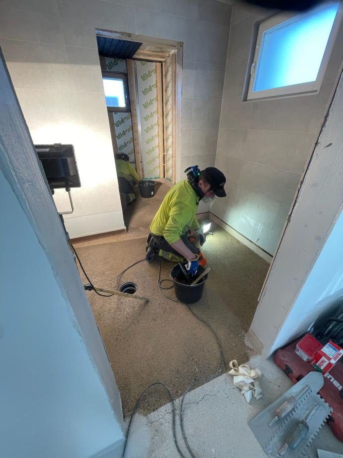 Pesuhuoneen laatoitusvaihe meneillään.