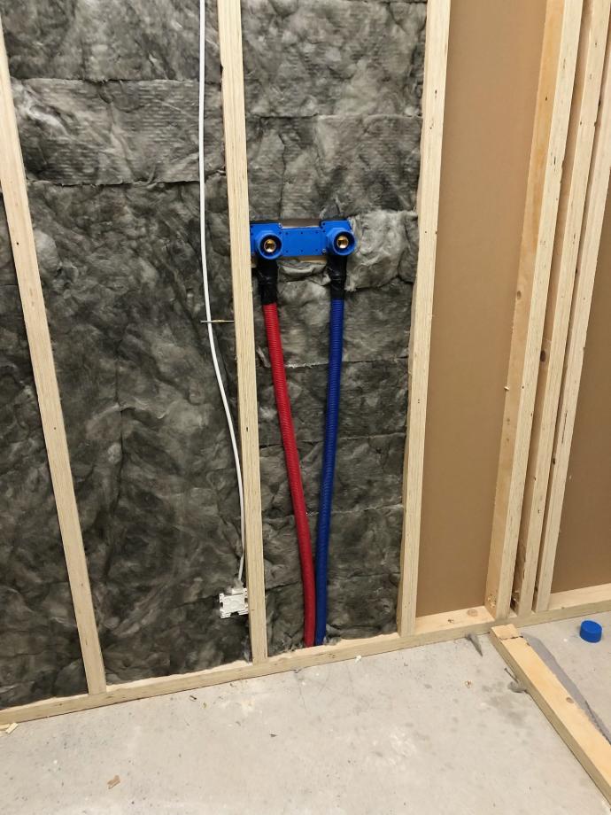 Käyttövesiputkien suojaputket ovat asennettu eristekerrokseen. Seuraavaksi asennettiin raudoitukseen myös lattialämmityksen putket. Myös pidempi kantava väliseinä perustuksineen näkyy kokonaisuudessaan.