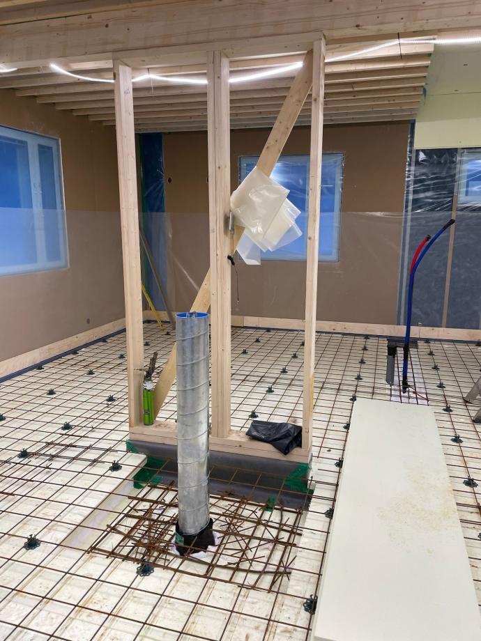 Raudoitustyöt alkoivat olla tehtynä; kuvassa näkyy myös keittiön ja olohuoneen välisen lyhyen kantavan väliseinän runko perustuksineen. Etualalla laatan vahvennos ja korvausilmaputki tulisijaa varten.
