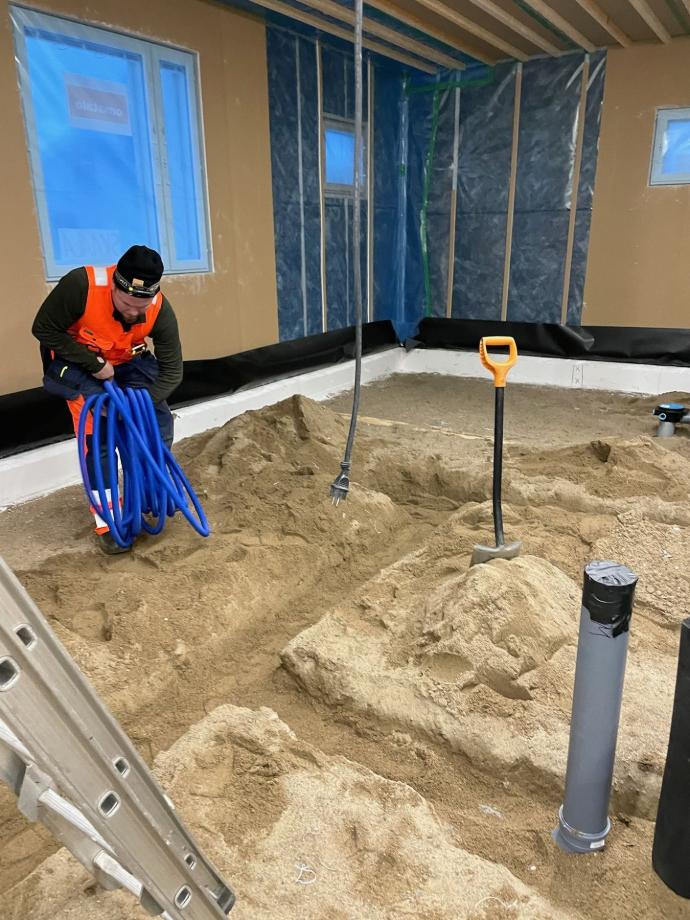 Lattian alle tulevien pohjaviemärien asennus.