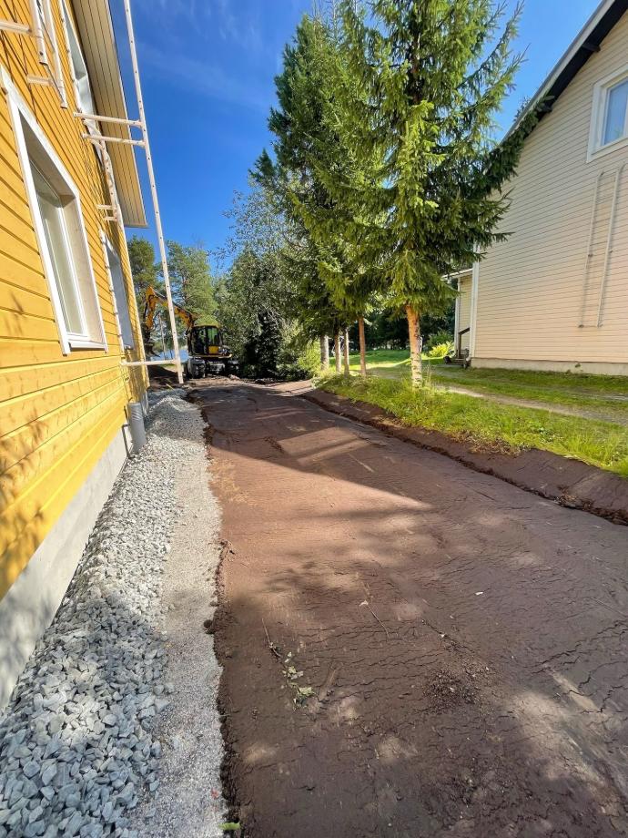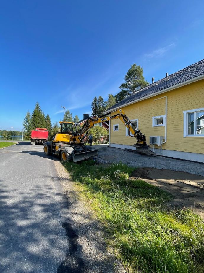 Elokuussa tehtiin pihan muotoilua ja mullan levitystä pikkukaivurilla.