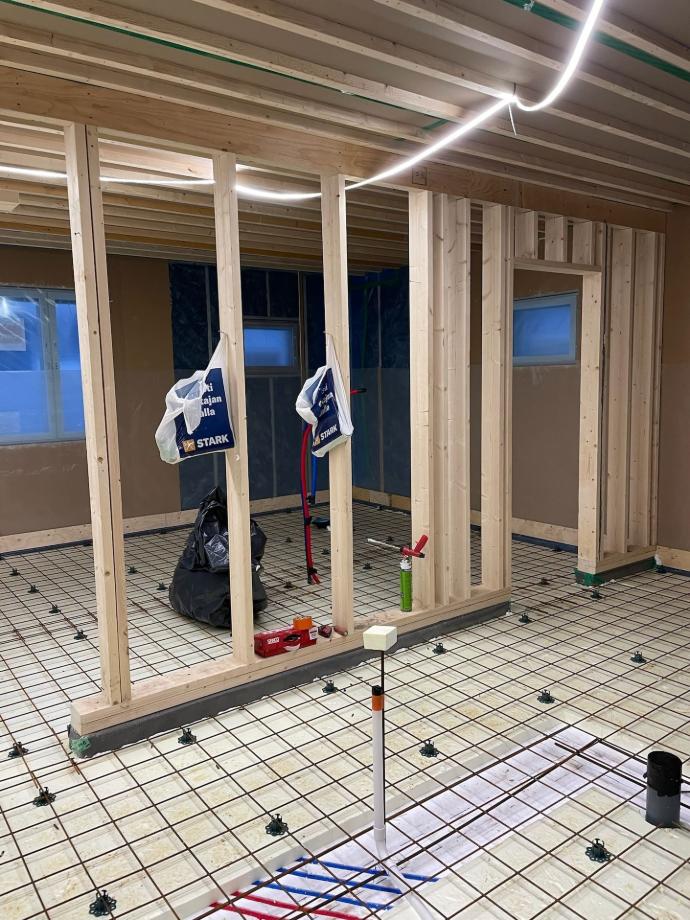 Väliseinien rakentaminen pääsi alkamaan nopeasti heti kun lattia oli valettu.