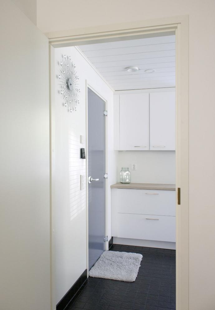Eteisestä aukeaa ovi pää-WC:een ja tilavaan, toimivaan kodinhoitohuoneeseen, jossa on myös kompakti tekninen tila maalämpöpumpulle, putkistoille ja iv-koneelle. Valmiina kokonaisuus on siististi liukuovien takana piilossa.