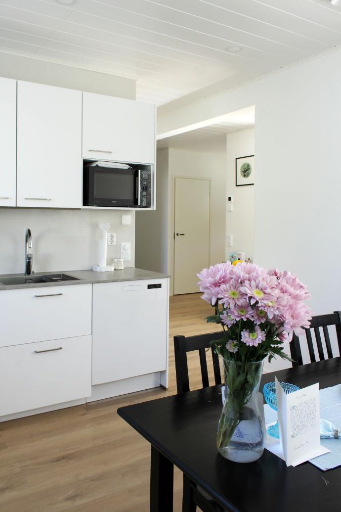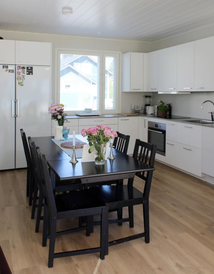 Valoisa keittiö on neliön muotoinen ja tilaa sekä toimivuutta riittää hyvin L-muotoon sijoitetuille kalusteille ja ruokapöydälle.