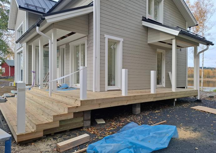 Julkisivu on lähes valmis sadevesijärjestelmää myöten! Myös reilunkokoinen etupihan terassin runko on valmiina ja kansilaudoitus aloitettu.
