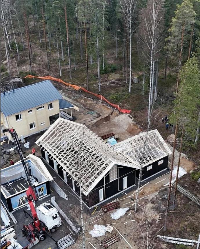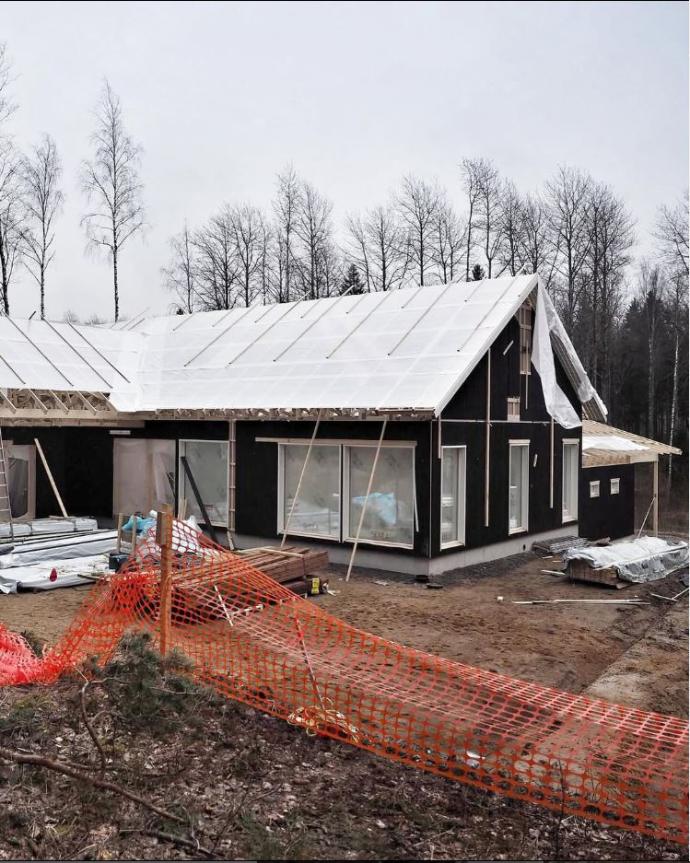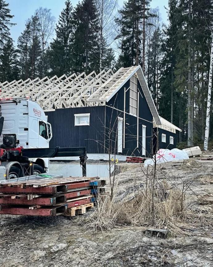 Talon pystytys tehty, autotalli vielä vaiheessa.