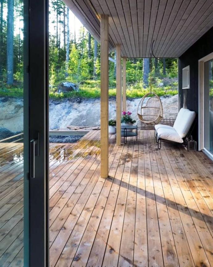 Suojaiselta terassilta aukeaa metsämaisema.