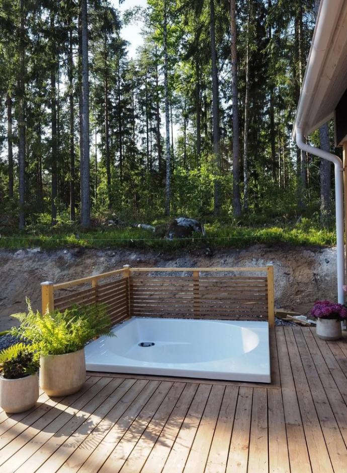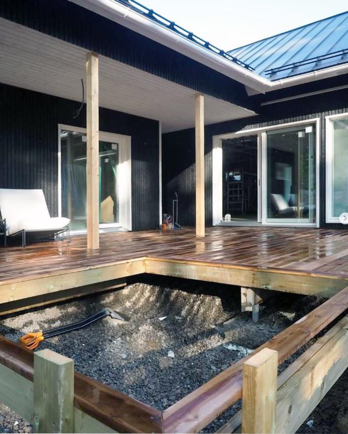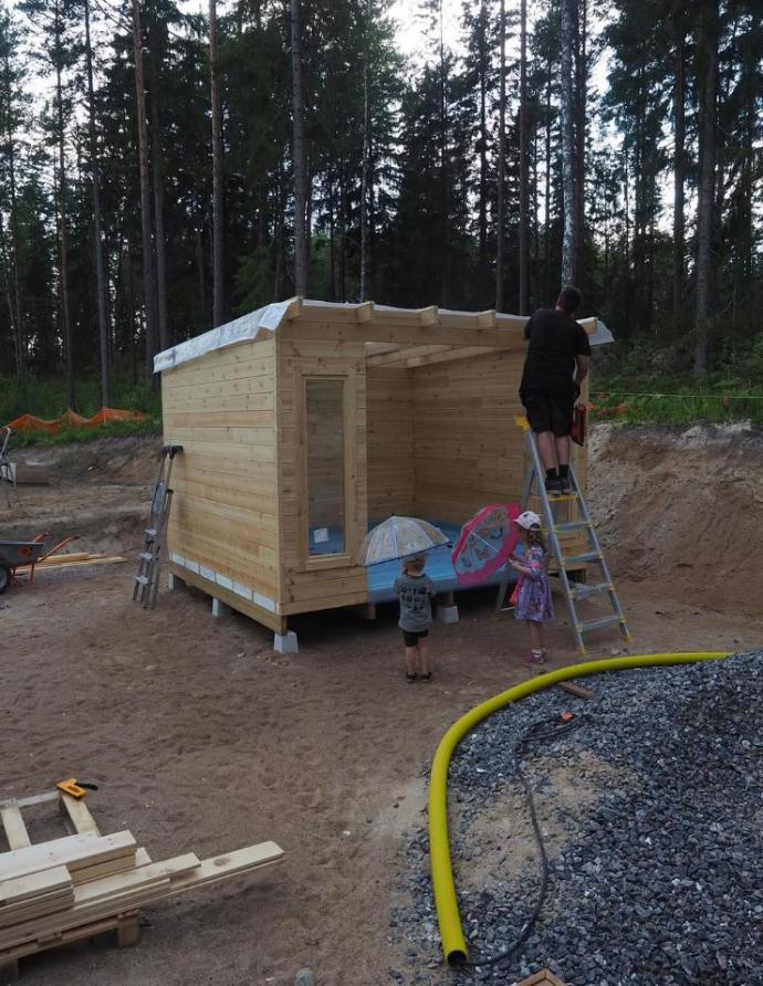 Rakentajaperhe halusi mukavan kahvittelu- ja oleskelutilan tontille jo rakennusajaksi. Heti lattiavalun jälkeen he alkoivat rakentaa terassin runkoa. Suojaisa suuri terassi on jo lähes tehty ja siinä on jo kunniapaikka valmiina kovasti odotetulle Drop heti valmis -altaalle!