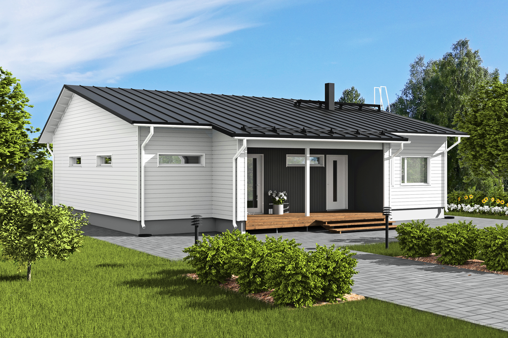 Peruskonseptiltaan ja tyyliltään tämä ihastuttava kolmen makuuhuoneen talo muistuttaa pienempää Inno 108:aa epäsymmetrisine kattomuotoineen, suojaisine kuisteineen ja leveine takaterasseineen. Tilava eteinen johdattelee reilunkokoisiin oleskelu- ja keittiötiloihin. Makuuhuoneet sijaitsevat omassa rauhassaan talon vastakkaisissa kulmissa. Khh- ja saunaosastossa riittää myös mukavasti neliöitä ja toimivuutta.